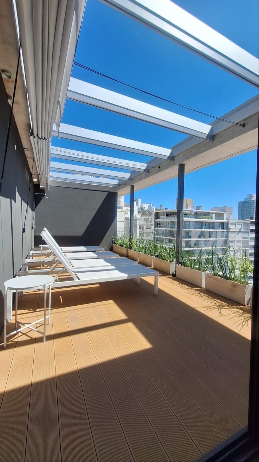 -Solarium en rooftop en el piso 10 con vista panorámica, orientación norte con excelente asoleamiento, de espaldas a los vientos dominantes y con intimidad preservada. Terraza con deck, reposeras y ducha escocesa al aire libre.