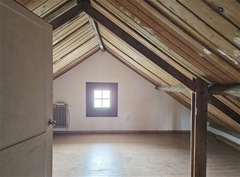 Escaleras en madera con mucha presencia que llevan a planta alta donde hay dos habitaciones con salida a terraza al frente y otra escalera que lleva a una tercera habitación tipo altillo .
